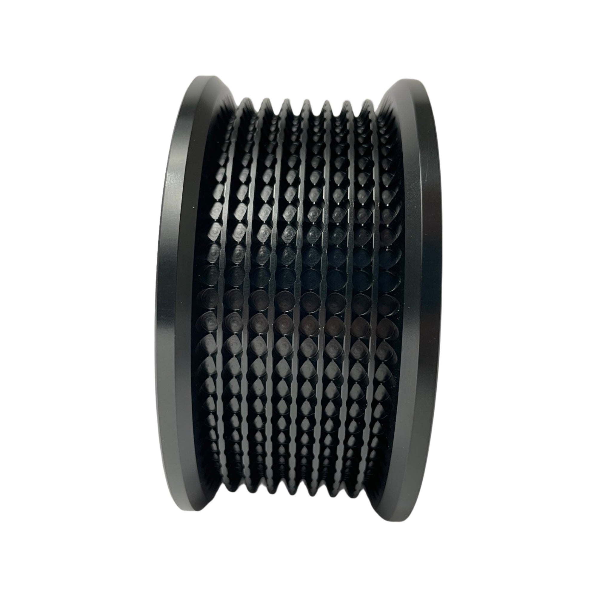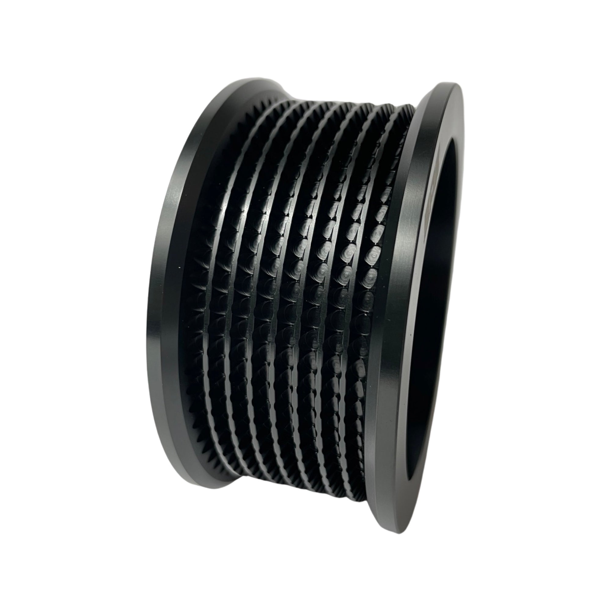 The patent pending CNC Convex Knurling process (CKP) on the SPE pulleys offers a perfect balance between belt grip and wear. The machining process allows the rib surface to offer varying grip under different belt loads. Under minimal boost (light Throttle) the belt tension is lower at the pulley face. The process offers a low load area for the belt to have normal factory like contact on the rib face allowing the belt to wear less over time. When load is applied it is wedged down into the Convex knurling the grip becomes more aggressive to the belt the higher the load (Boost demand) becomes.  This keeps the belt on a perfect grip/wear threshold. Unlike Laser surface etching found on our competitors pulleys our process doesn't degrade or wear off. Since our pulleys don't wear they are more consistent giving the customer better track times and dyno numbers.  Although SPE's CNC Convex Knurling Process is costly to produce we are more concerned with providing our customers the best quality product at the best price possible.