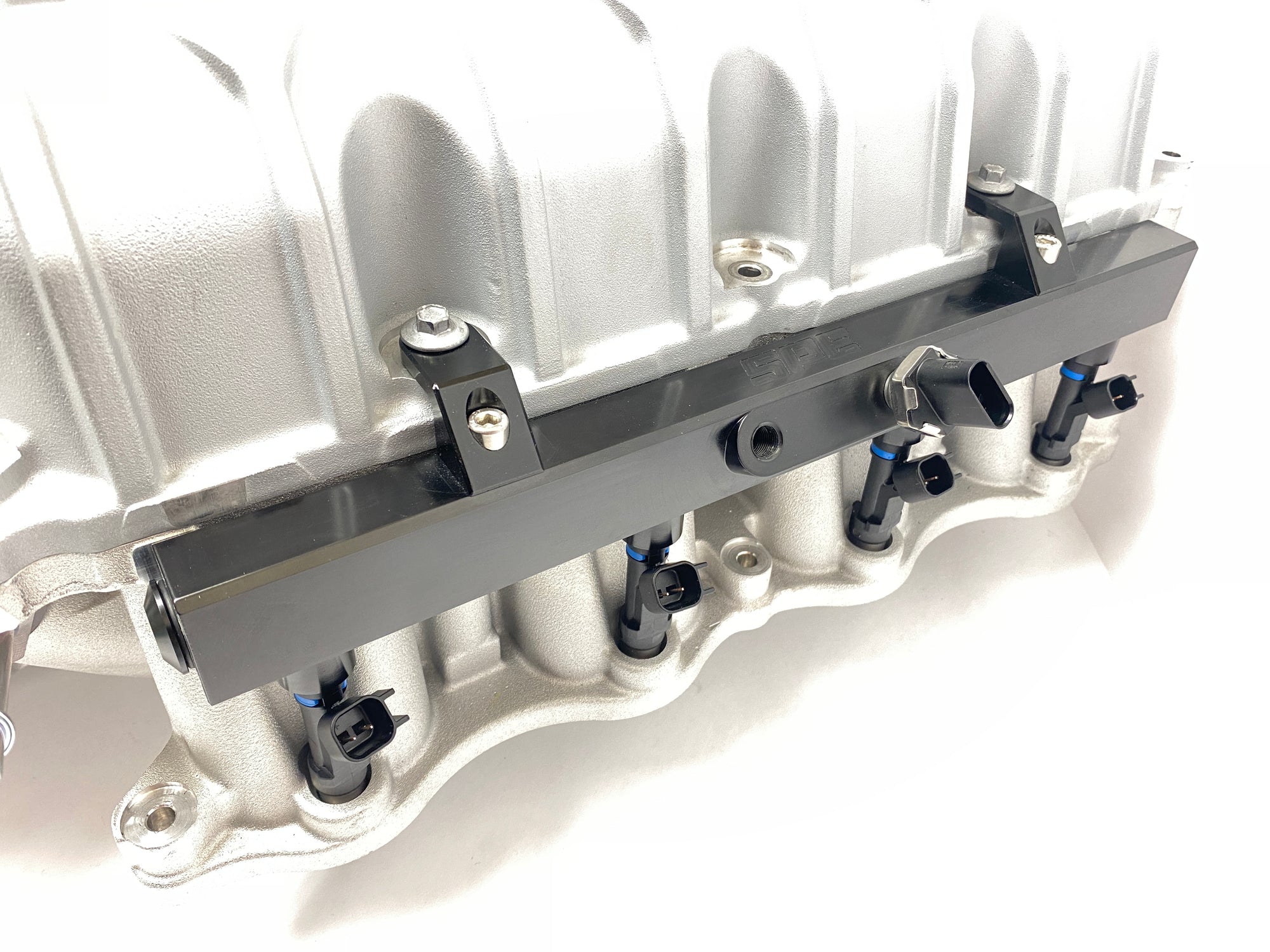 SPE is happy to introduce our new 2020+ Shelby GT500 mustang billet fuel rails. When trying to make more horsepower with the new GT500, be it with pump gas, race gas, or E85, the factory fuel rails become a bottleneck mainly due to the way the fuel is distributed to the rails. The feed hose tees in from the side and has to be distributed to two rails through a very inefficiently designed crossover fitting assembly. This is only good for manufacturing purposes. SPE decided to make a fuel rail kit that not only addressed the performance issues but makes them more functional and aesthetically pleasing.