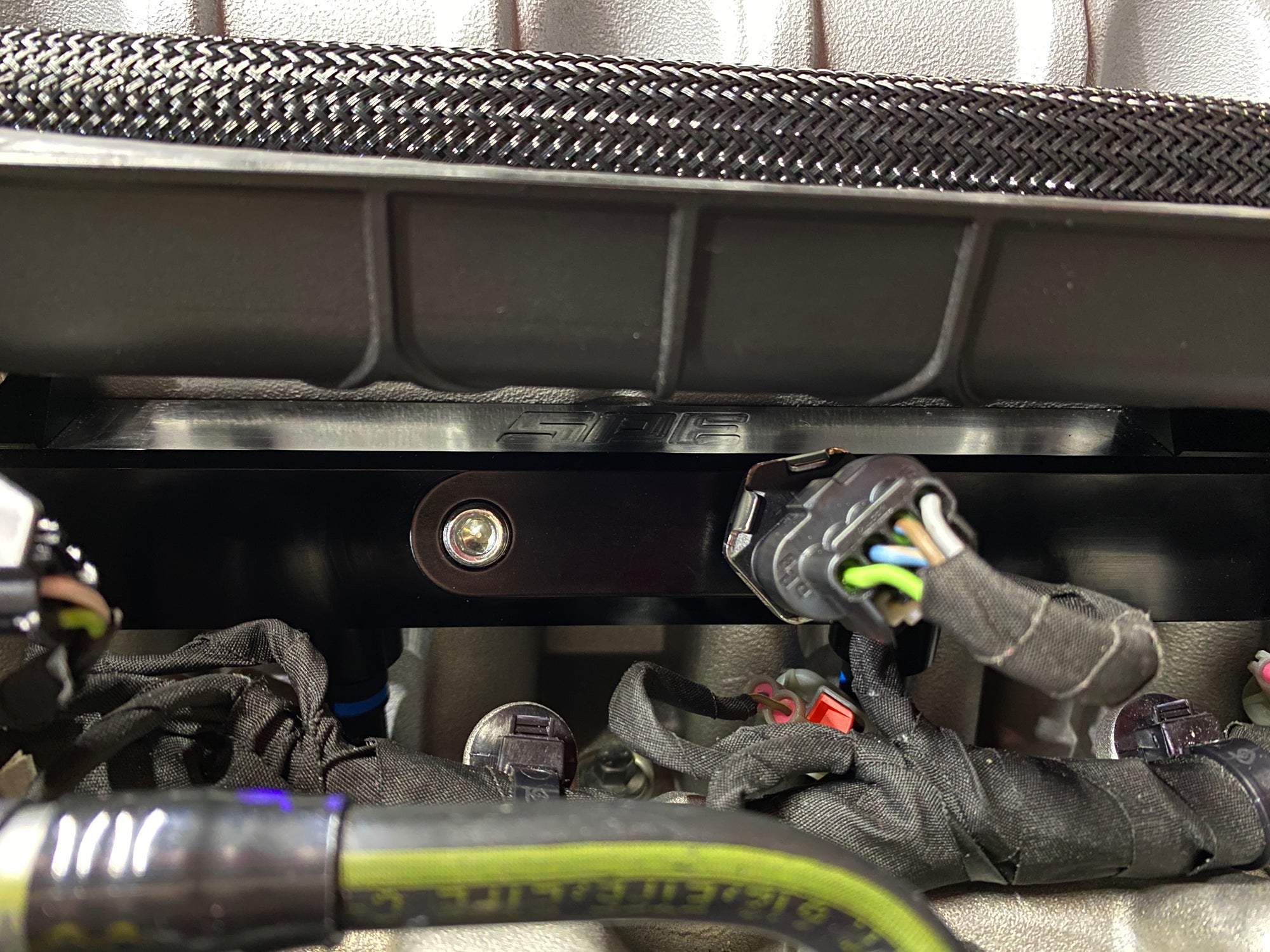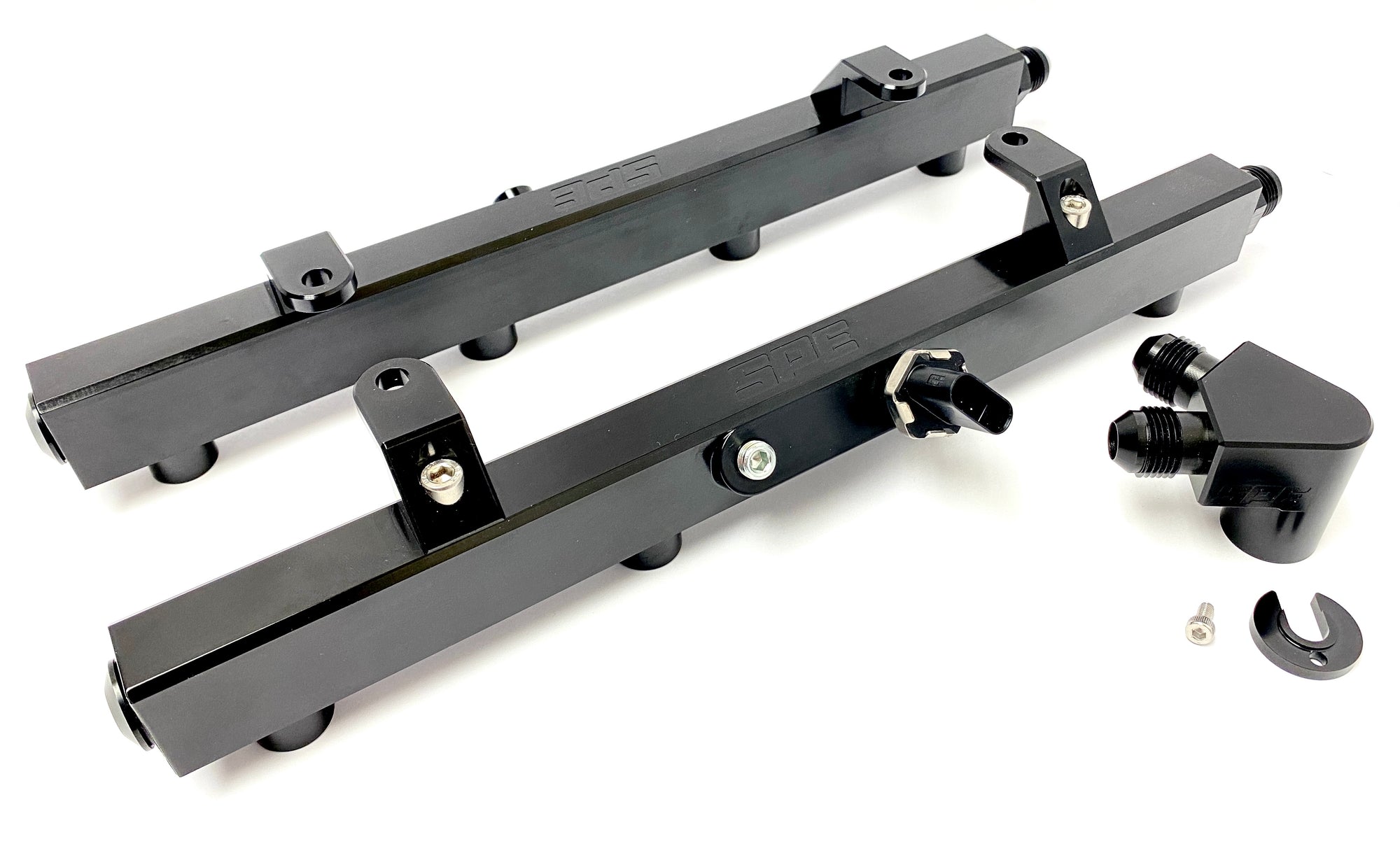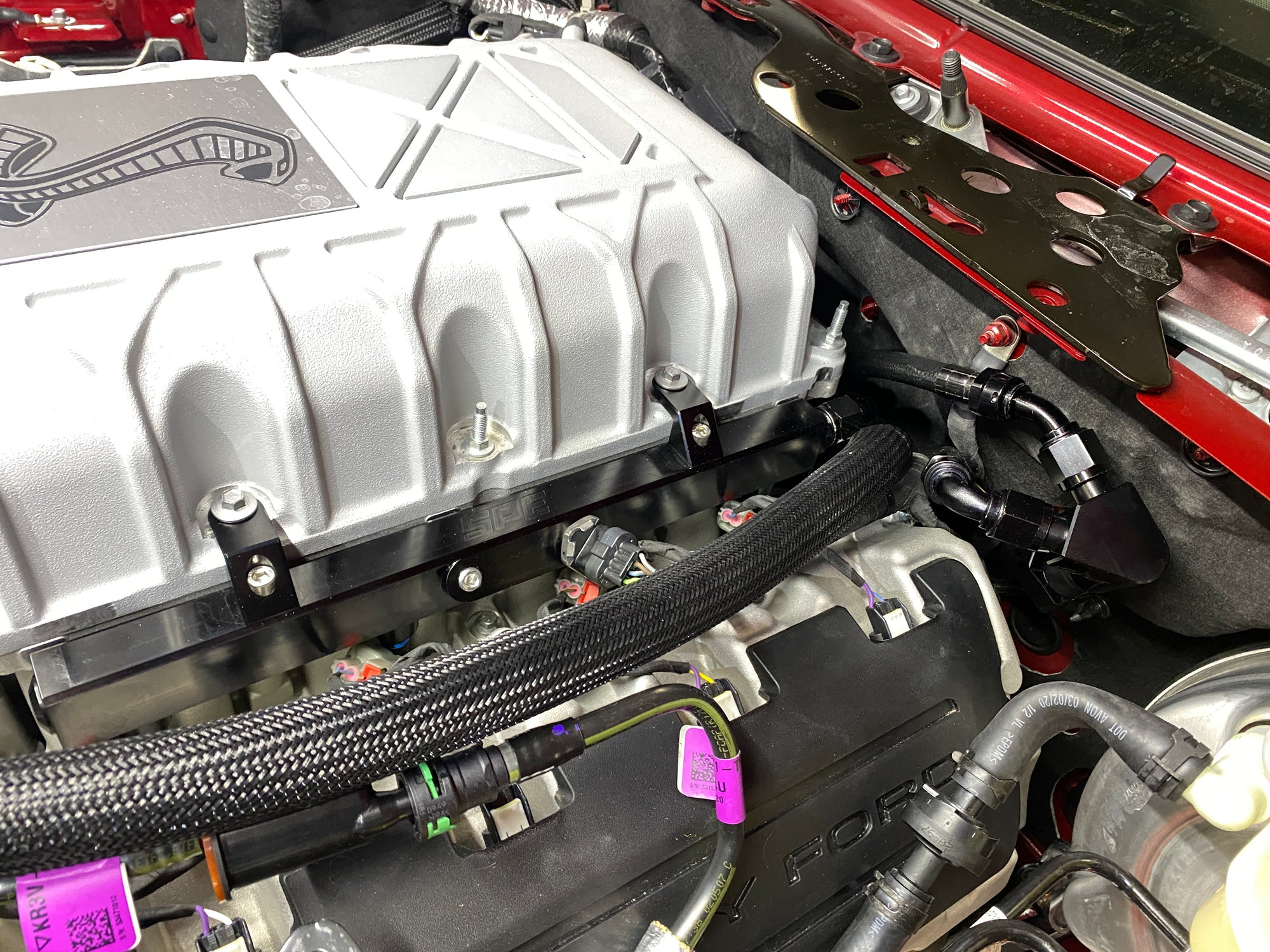 This is a complete fuel rail kit for your 2020+ Shelby GT500 which includes the fuel rails as well as all necessary hoses and fittings to install on your car using the factory fuel line up to the firewall. The fuel rails are -8 AN size made from billet aluminum and are anodized black. SPE designed the -8AN quick disconnect Y fitting for distributing fuel to the rails specifically for the car to help create a seamless clean installation. There's no need for off the shelf adapters in our kit. SPE also changed the angle of the factory fuel pressure sensor to allow for more clearance to keep it clear of the wiring harness. We also added two 1/8th inch NPT ports on each rail for fuel pressure or auxiliary fuel feed for nitrous systems. The Fragola PTFE stainless braided andĀ PVC coated hoses are American made and compatible with all fuels including E85.Ā