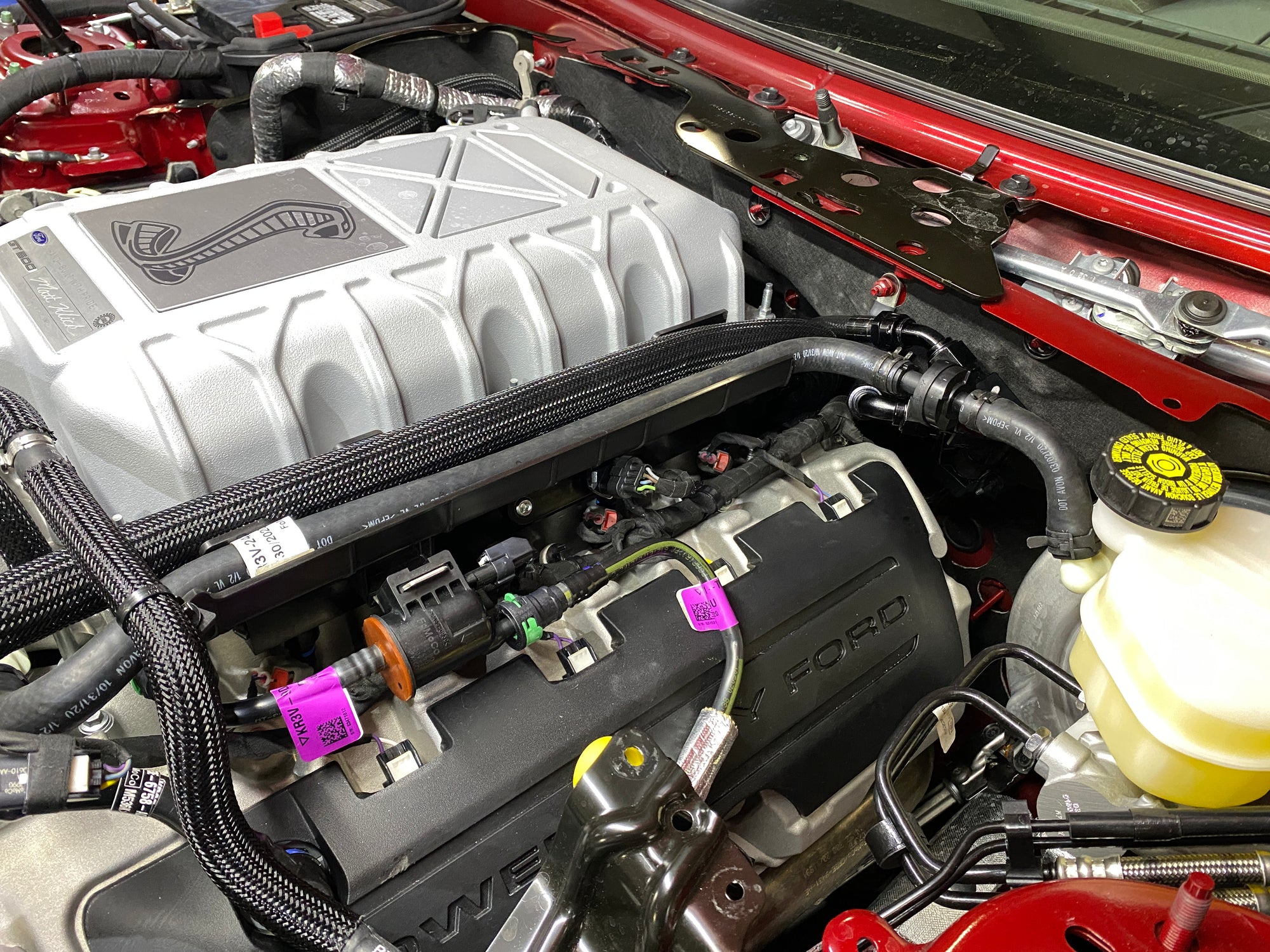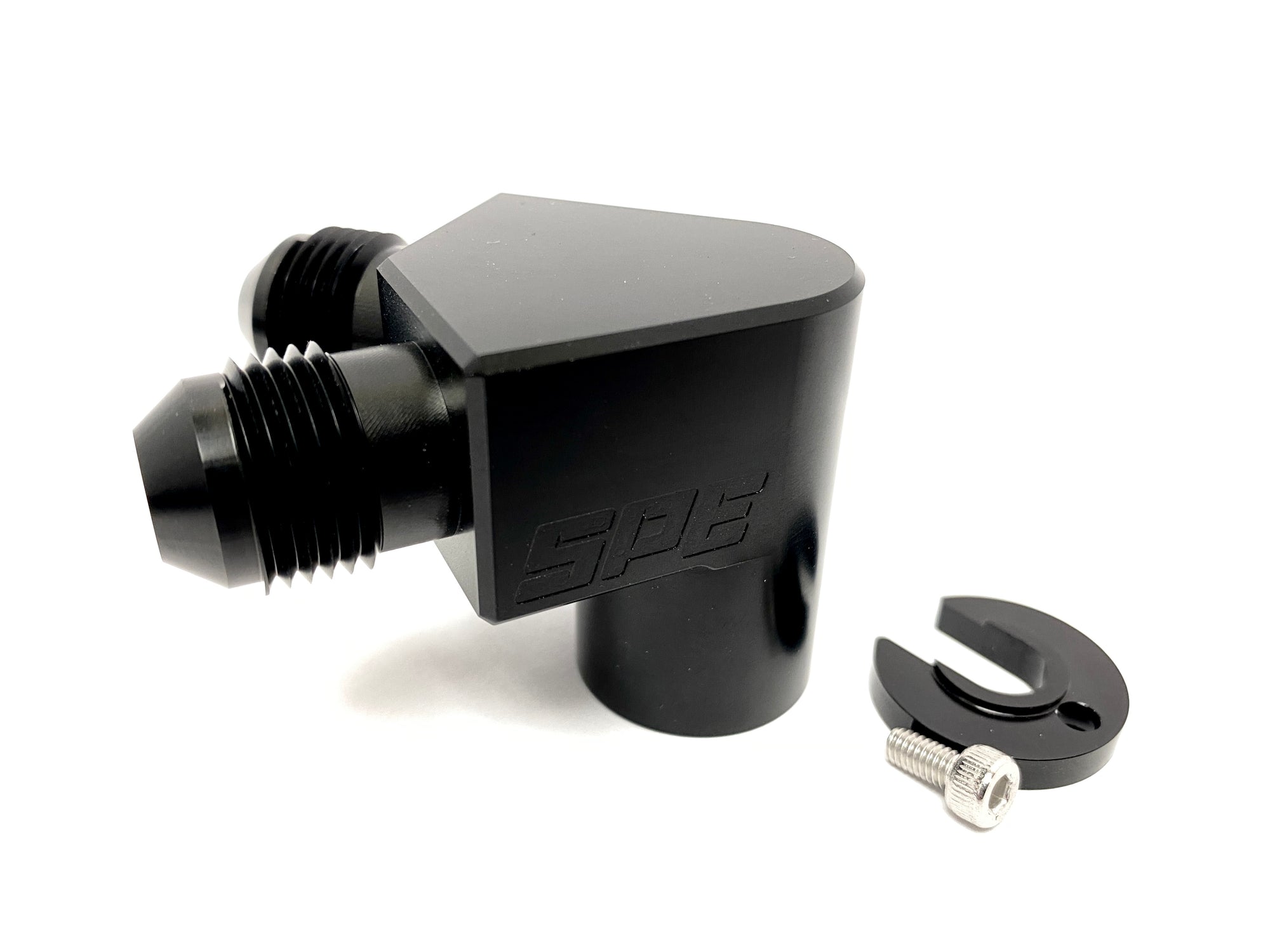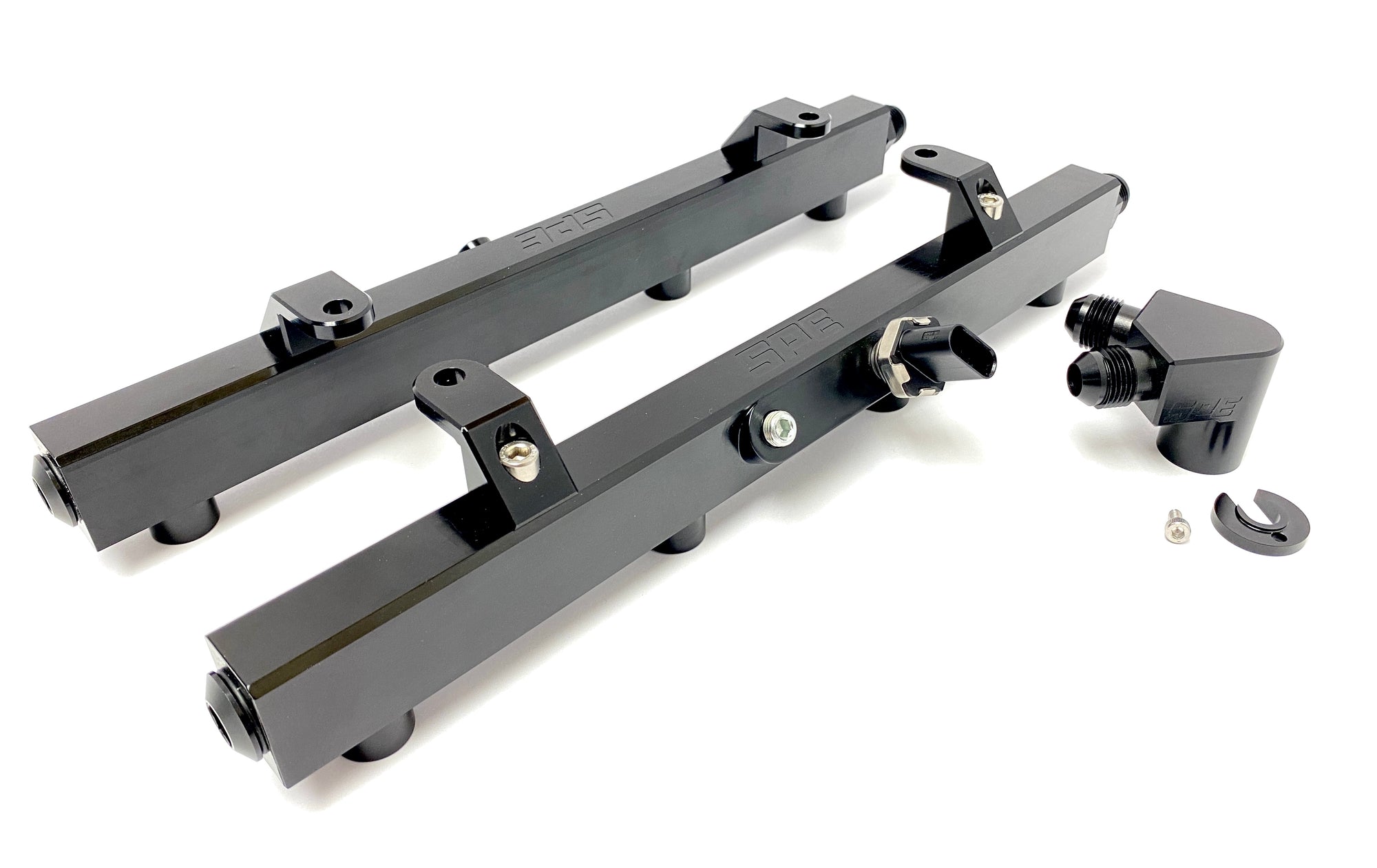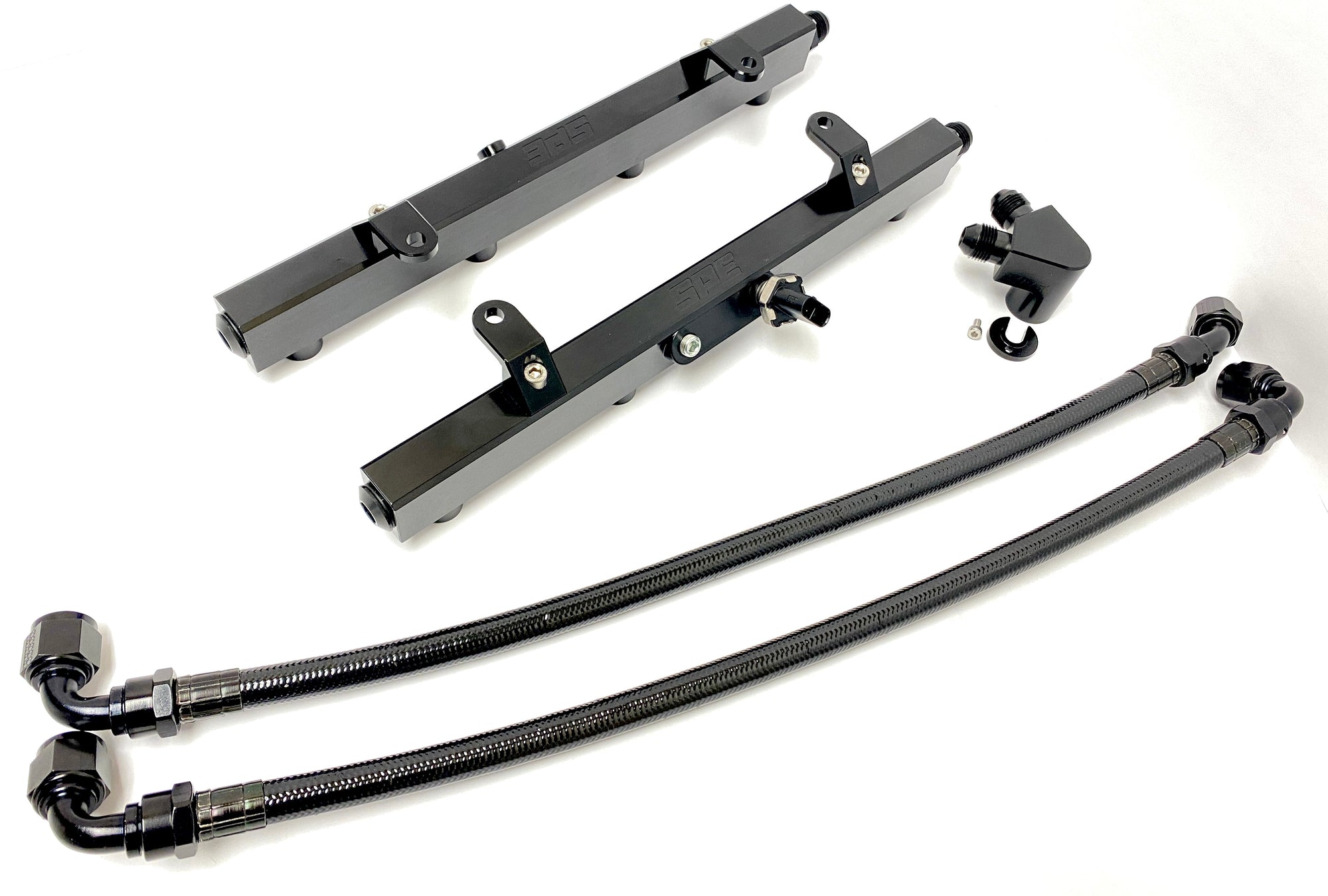 This is a complete fuel rail kit for your 2020+ Shelby GT500 which includes the fuel rails as well as all necessary hoses and fittings to install on your car using the factory fuel line up to the firewall. The fuel rails are -8 AN size made from billet aluminum and are anodized black. SPE designed the -8AN quick disconnect Y fitting for distributing fuel to the rails specifically for the car to help create a seamless clean installation. There's no need for off the shelf adapters in our kit. SPE also changed the angle of the factory fuel pressure sensor to allow for more clearance to keep it clear of the wiring harness. We also added two 1/8th inch NPT ports on each rail for fuel pressure or auxiliary fuel feed for nitrous systems. The Fragola PTFE stainless braided andĀ PVC coated hoses are American made and compatible with all fuels including E85.Ā
