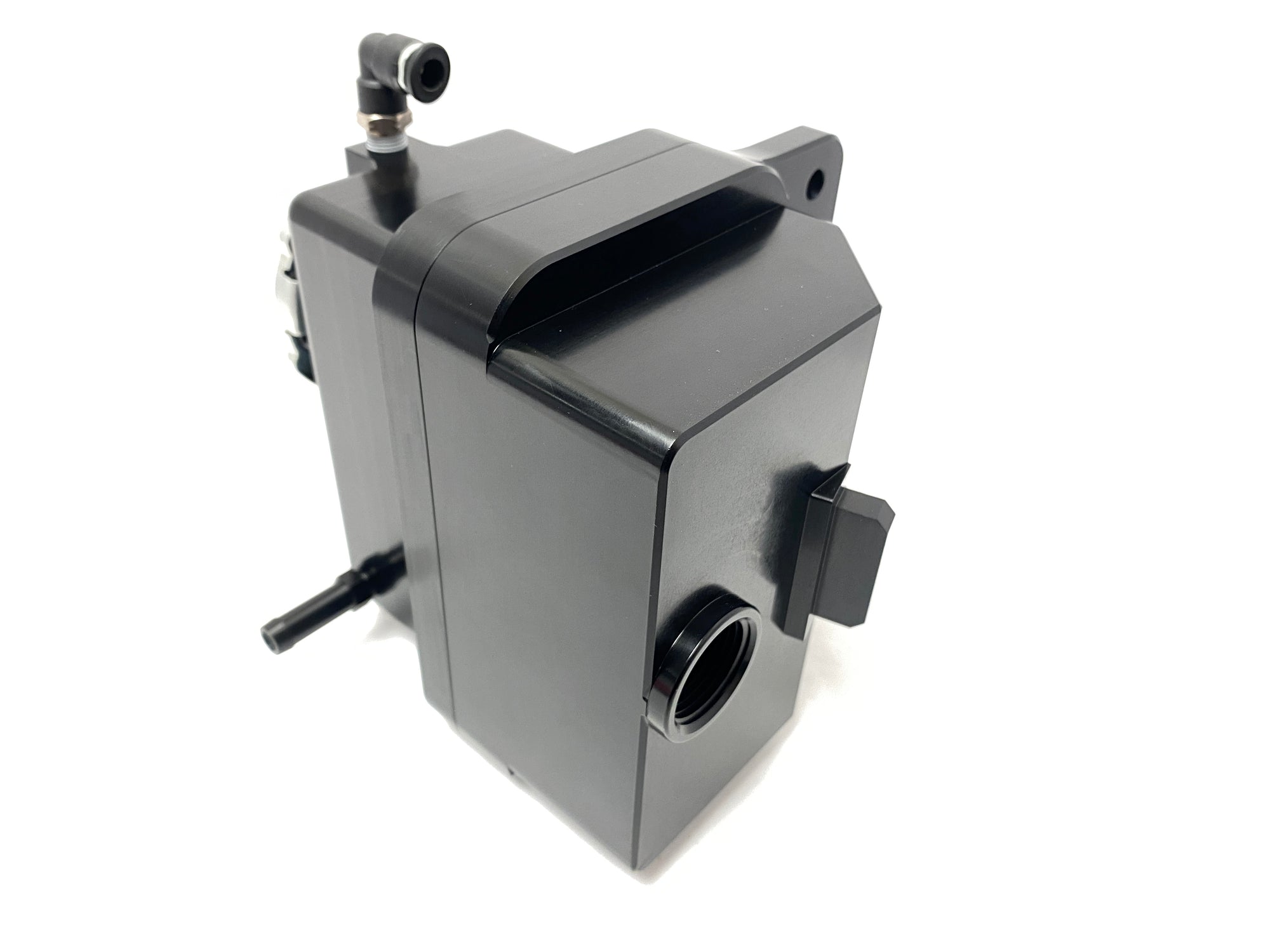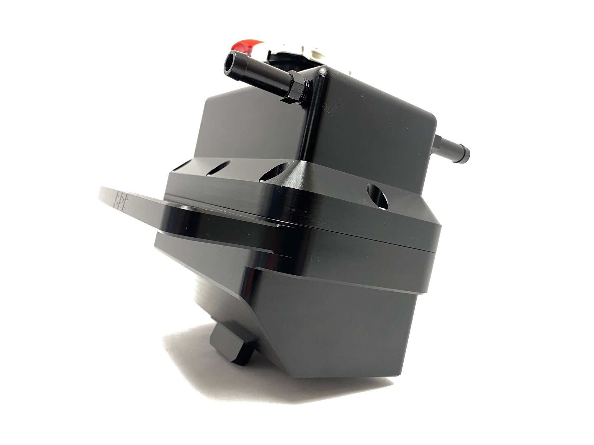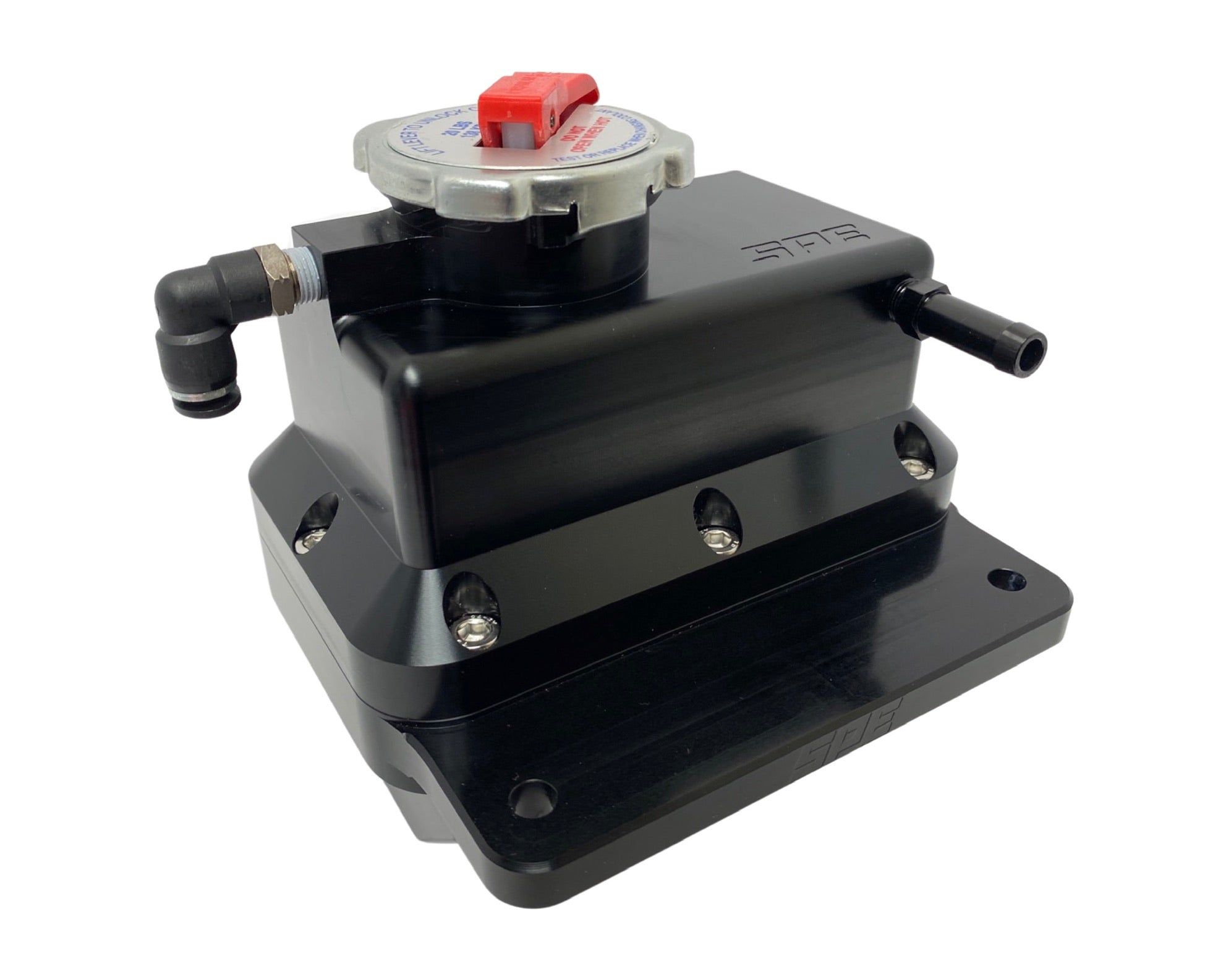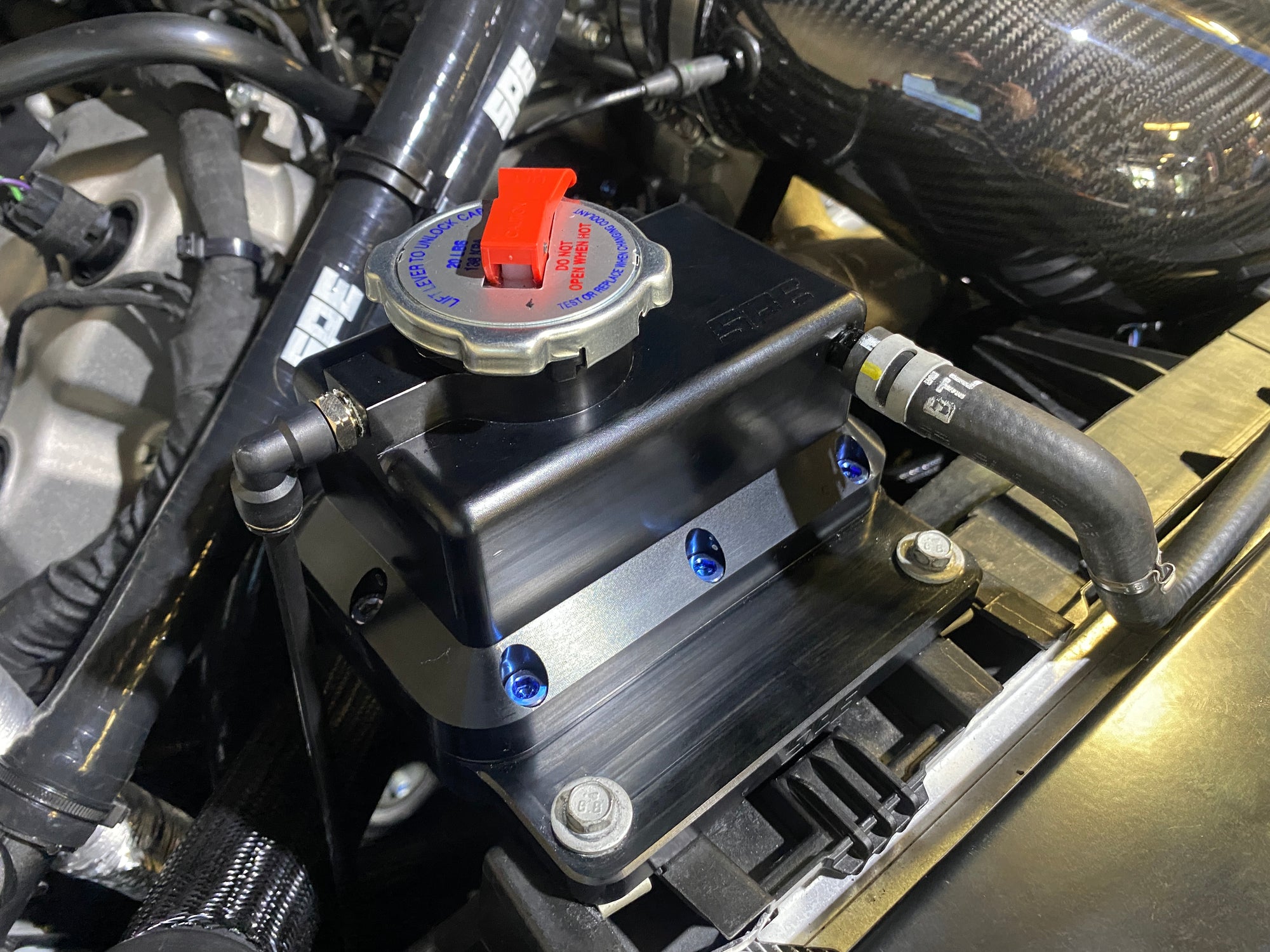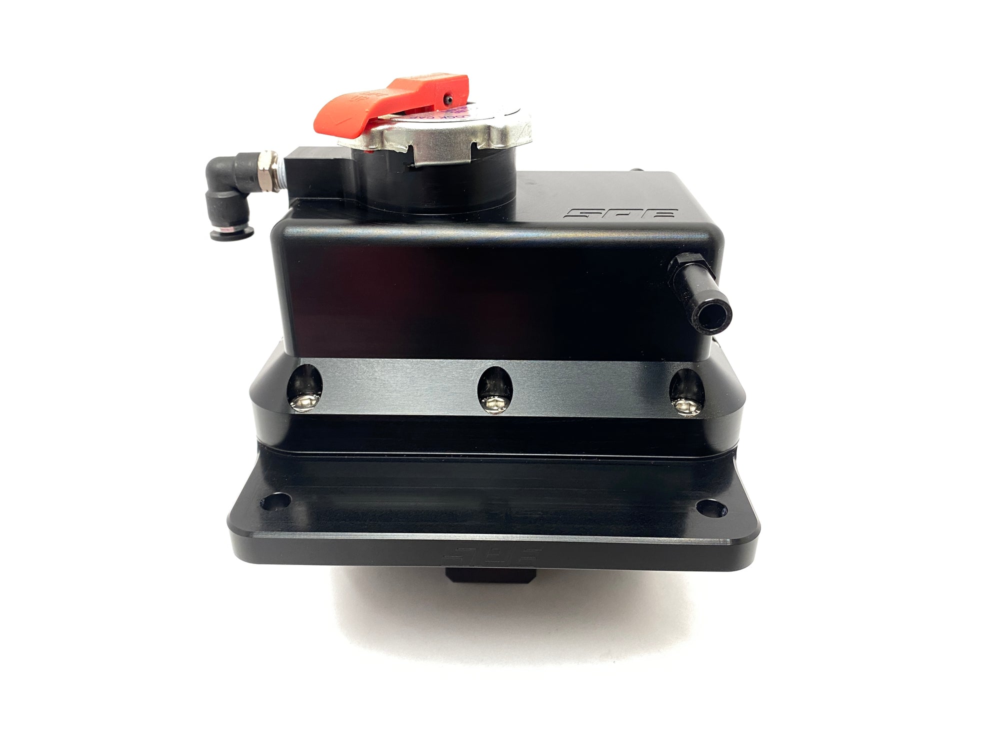 The SPE billet coolant degas bottle includes the fittings and hose ends needed to install it. The billet 2 piece design uses the factory mounting positions. The halves are sealed by an o-ring not a gasket or sealant. SPE also changed to a standard vent cap for ease of replacement and also safety. The lever cap we use allows the customer to vent the system even when hot if needed. It also vents safely out of the side of the bottle under head gasket failure or other over pressurizing situations instead of all over the engine bay. Glycol/coolant is flammable so safely controlling the venting of it is key in high performance applications.