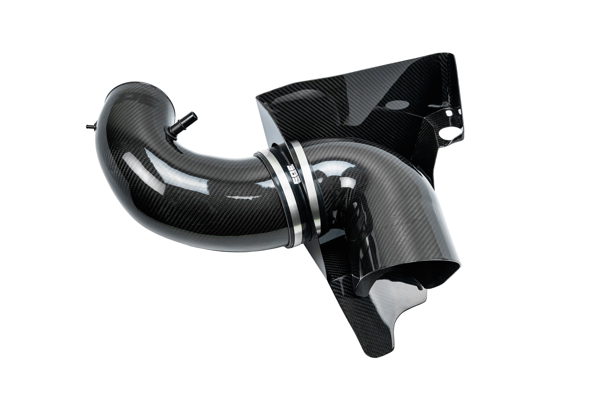 The track tube is 3k twill carbon fiber manufactured in billet molds and then processed in an autoclave. All excess resin is pulled out under vacuum creating a strong light weight part. It is designed to work with our Stage 1 and Stage 2 GT500 Intake Kits. It connects to the filter end of our carbon intake tube and terminates in front of the grill snorkel but does not seal tight to it. This allows for as much possible air volume to be pulled in at lower vehicle speeds and still utilize the ram air affect of the grill as well. It fills the void and uses all the space provided.