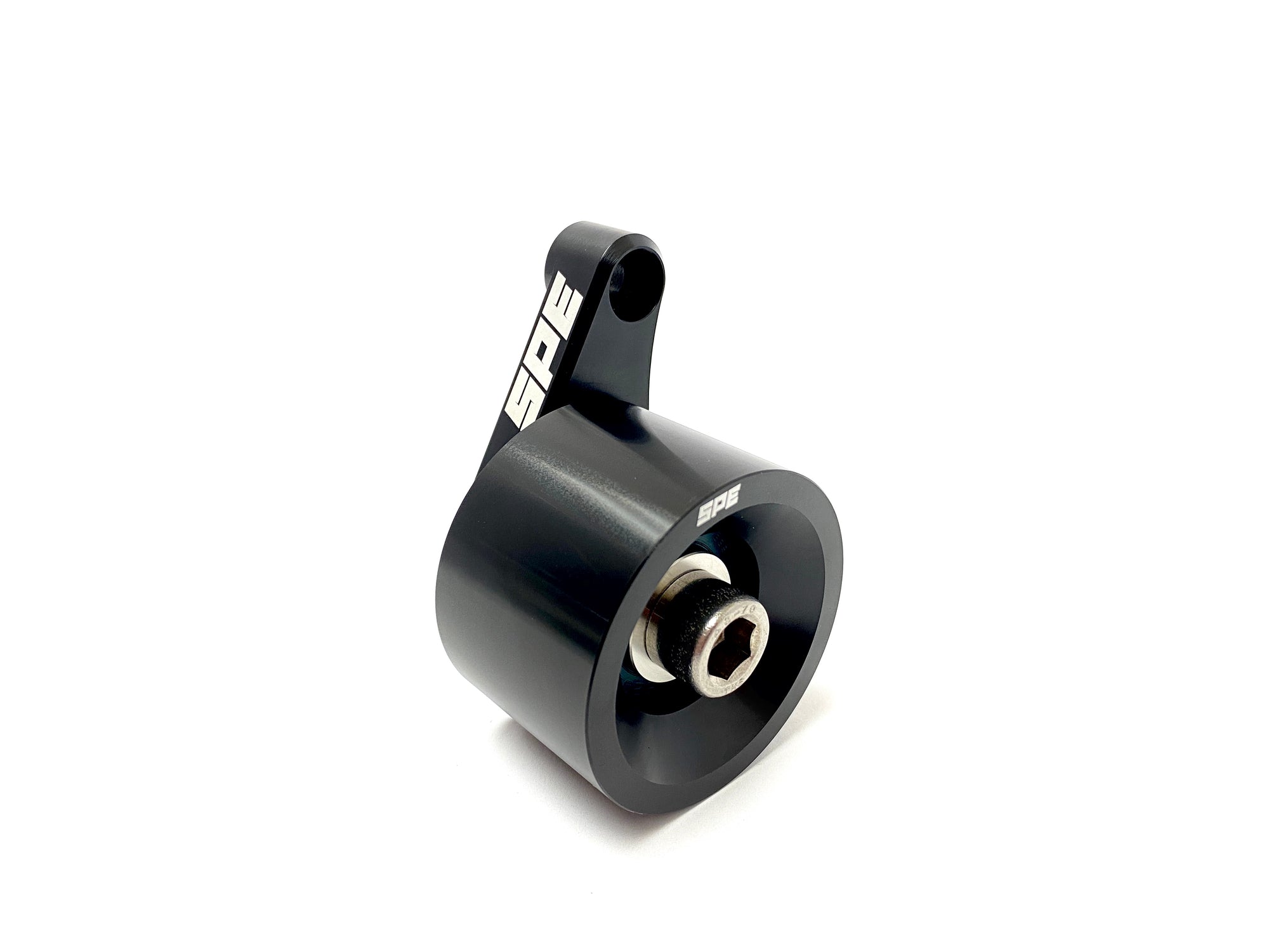 The SPE 2020+ GT500 Fixed Aux Idler consists of a precision CNC machined billet aluminum bracket, and extreme duty double ball bearing black anodized idler pulley. The Fixed Aux Idler bolts to existing bolt bosses on the vehicle's supercharger snout and locates the pulley just to the left of the supercharger pulley, maximizing belt wrap and eliminating slippage. Designed to work in conjunction with the SPE GT500 blower pulley system. Perfect to pair with 2.6” and smaller blower pulleys. No modifications to the vehicle are necessary. The idler assembly ships fully assembled, and the required fasteners and illustrated installation instructions.
