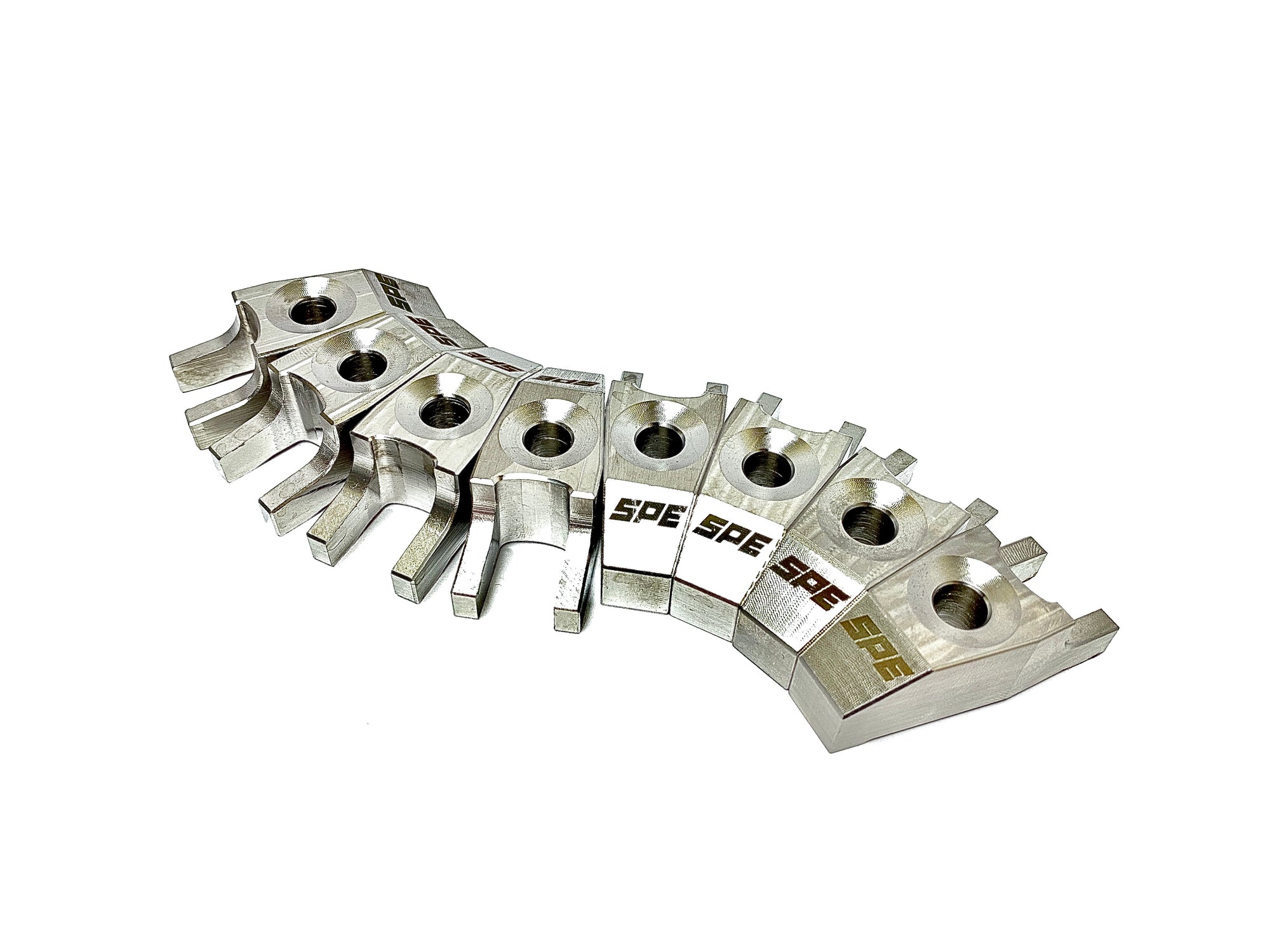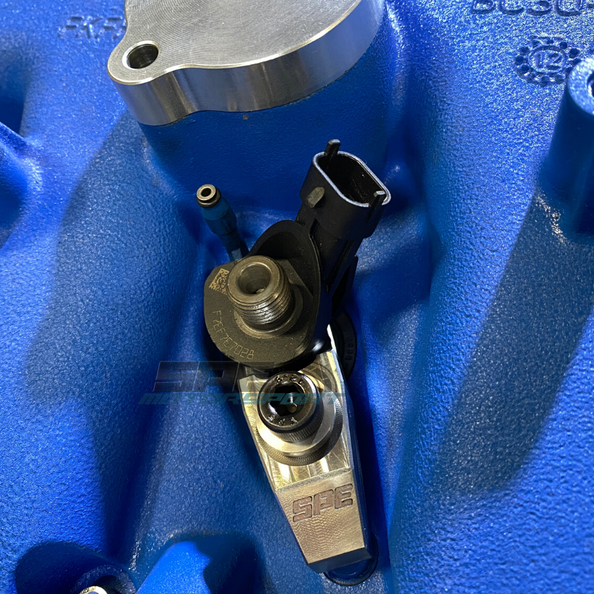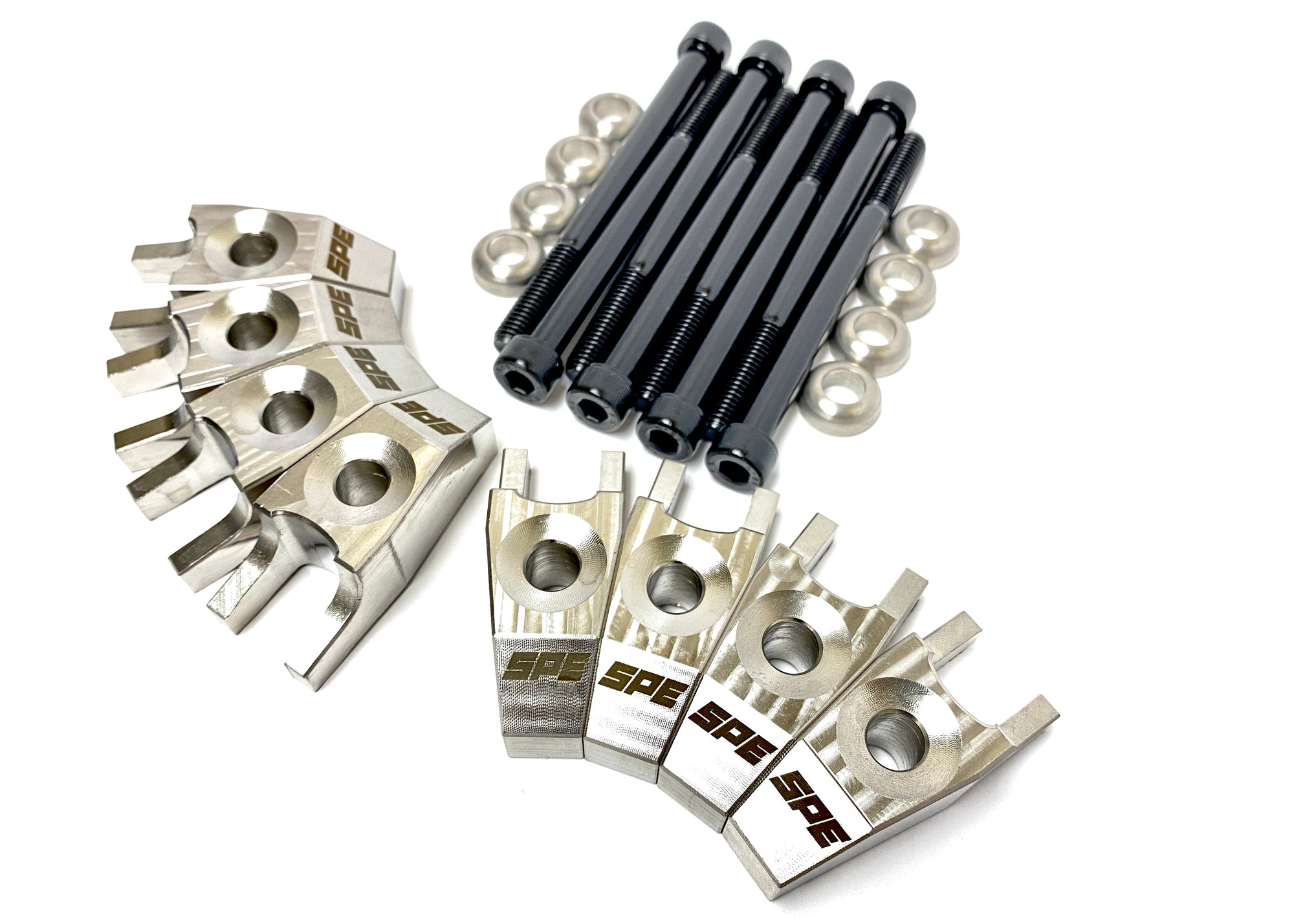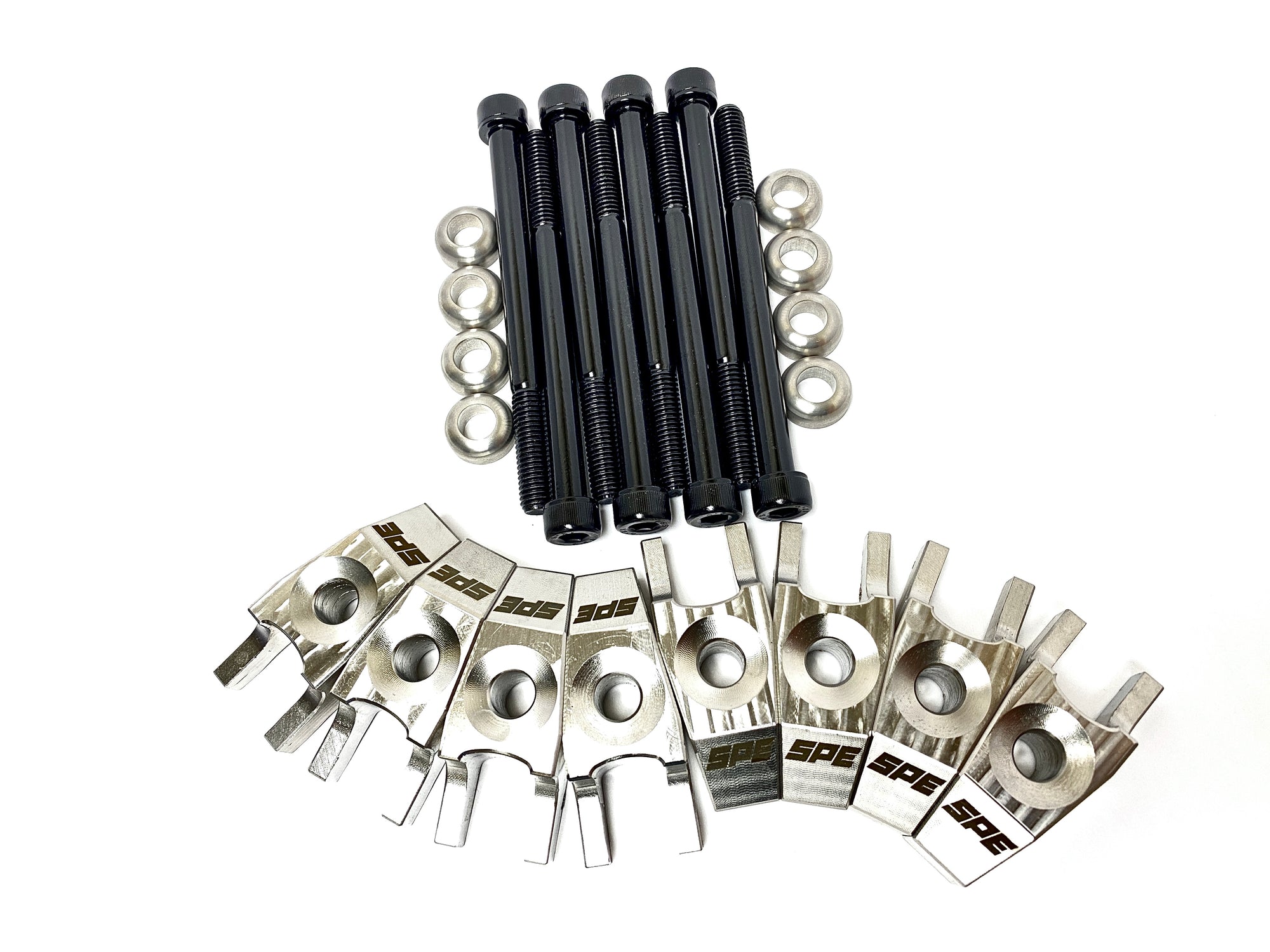 The SPE 6.7L Powerstroke Injector Hold Down Kit is designed as a direct OEM fit to replace the brittle cast steel (& stamped steel) injector forks and torque to yield (TTY) bolts installed by the manufacturer.