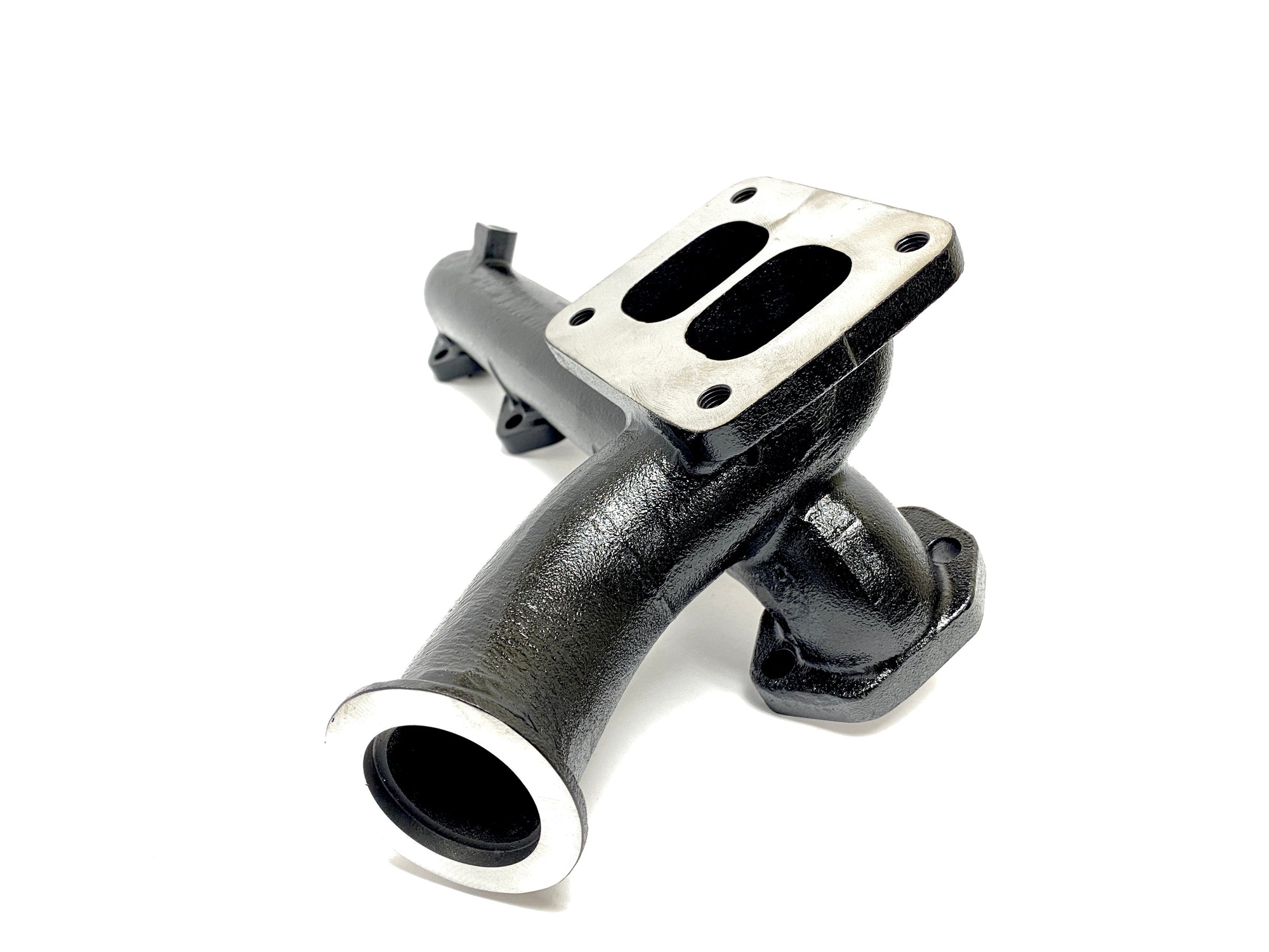 The manifold kit allows you to easily bolt up any t4 turbo including s300 and s400 styles. This is a great kit for someone looking to do a custom turbo setup and intake piping (or use of a competitors kit). This allows you to get creative with whatever t4 turbo you desire. The oil drain that is included is trimmable to fit almost any size turbo, length wise.