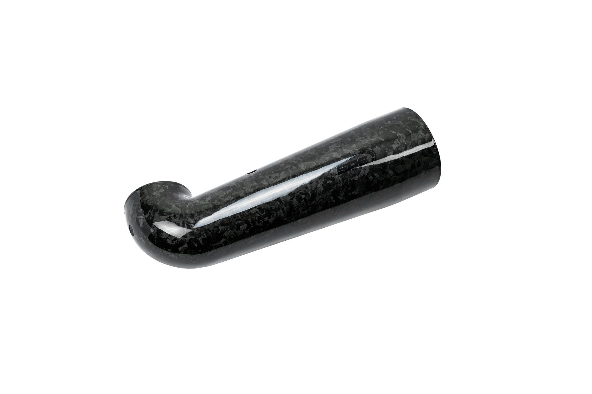 Our main inlet tube is made of genuine forged carbon fiber manufactured in billet molds and then processed in an autoclave. All excess resin is pulled out under a vacuum, creating a strong, lightweight part. It has a large 4.5" opening on the throttle body side, terminating to a large 6" opening for the filter engineered into the best possible shape from point A to B with no weird flat clearance spots. It fills the void and uses all the space provided.