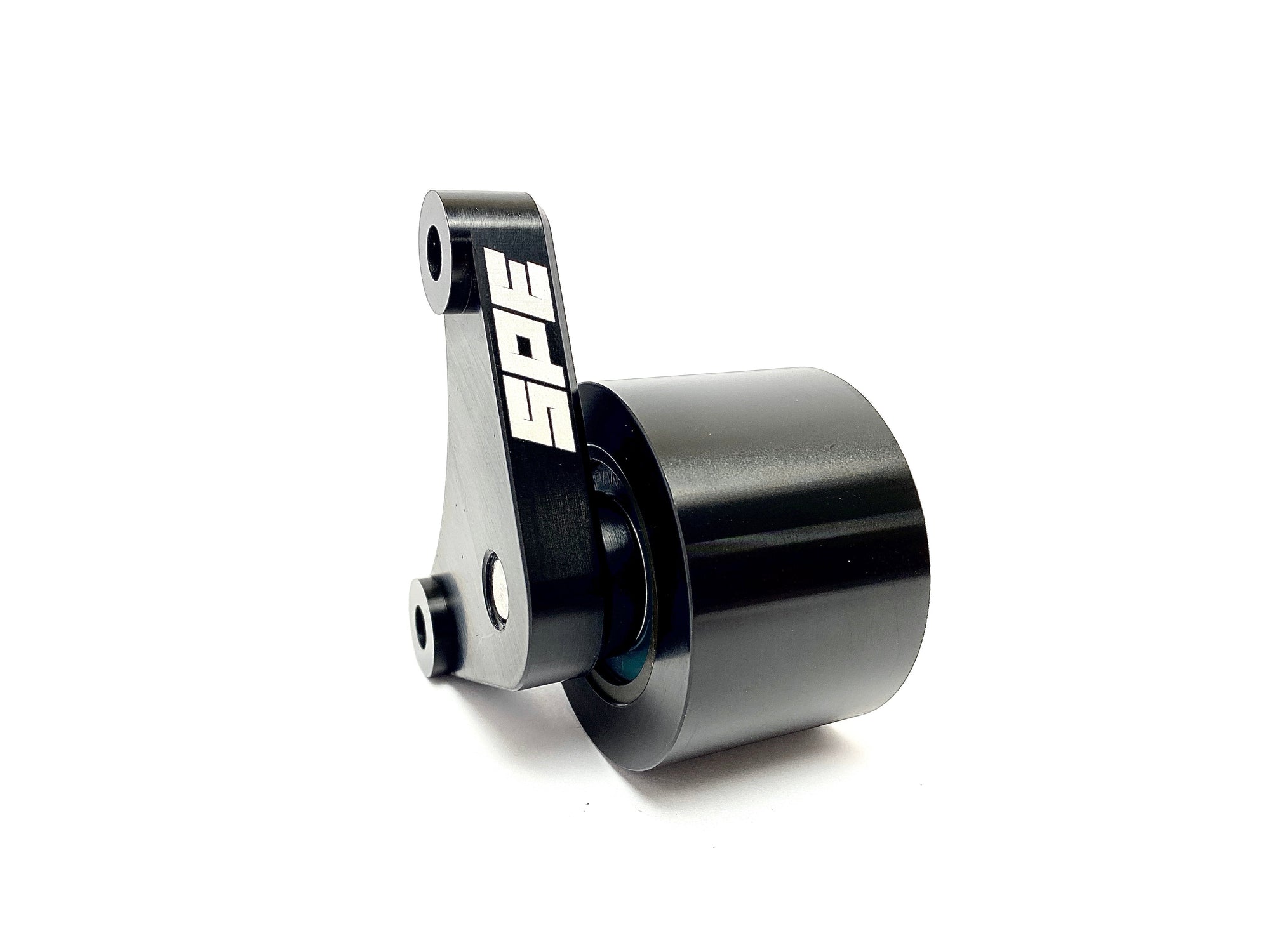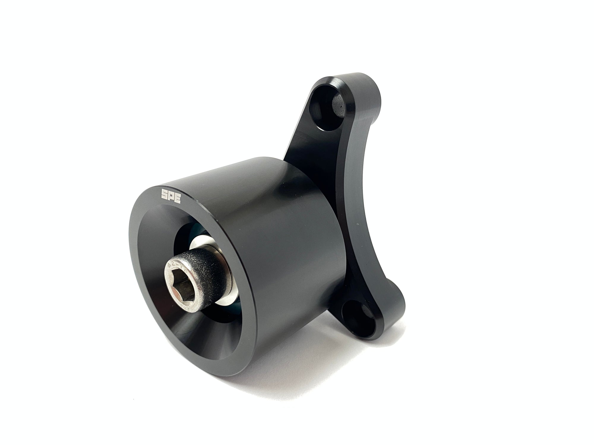 The SPE 2023+ Raptor R Fixed Aux Idler consists of a precision CNC machined billet aluminum bracket and extreme duty double ball bearing black anodized idler pulley. The Fixed Aux Idler bolts to existing bolt bosses on the vehicle's supercharger snout and locates the pulley just to the left of the supercharger pulley, maximizing belt wrap and eliminating slippage. Designed to work in conjunction with the SPE Raptor R blower pulley system. Perfect to pair with 2.6” and smaller blower pulleys. No modifications to the vehicle are necessary. The idler assembly ships fully assembled, and the required fasteners and illustrated installation instructions.