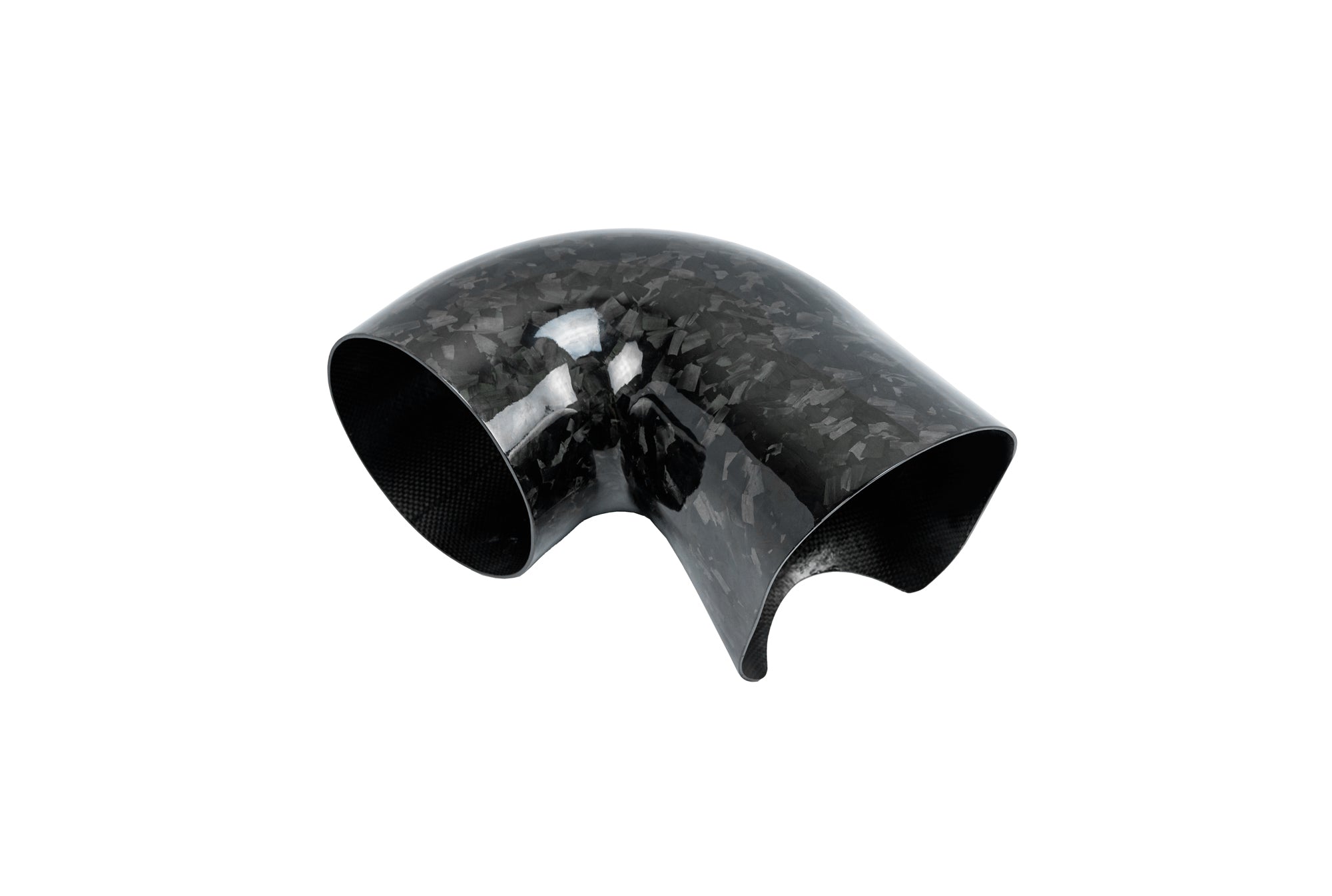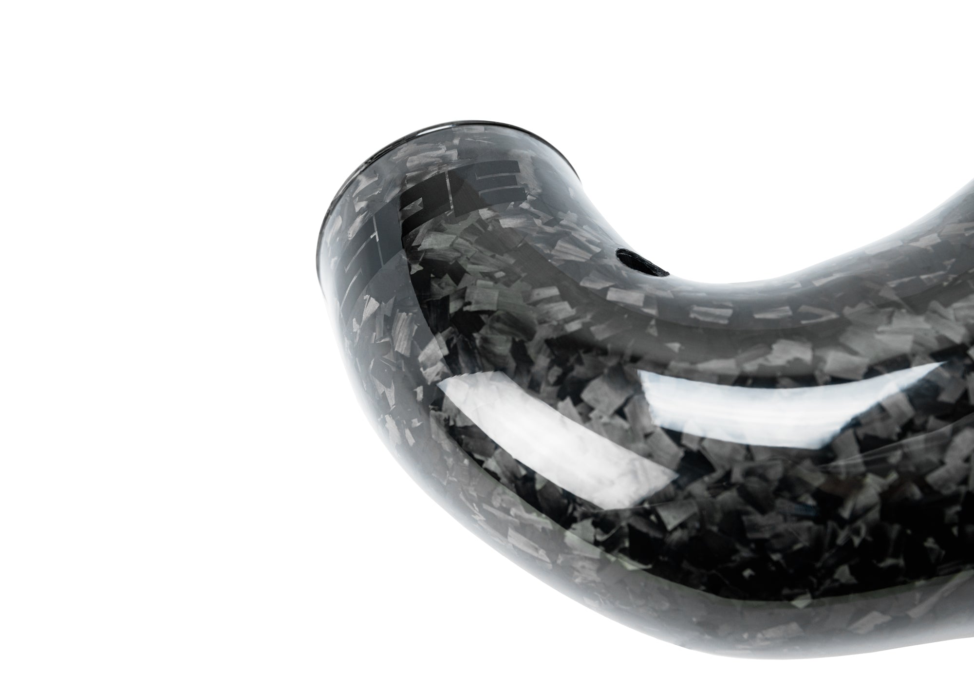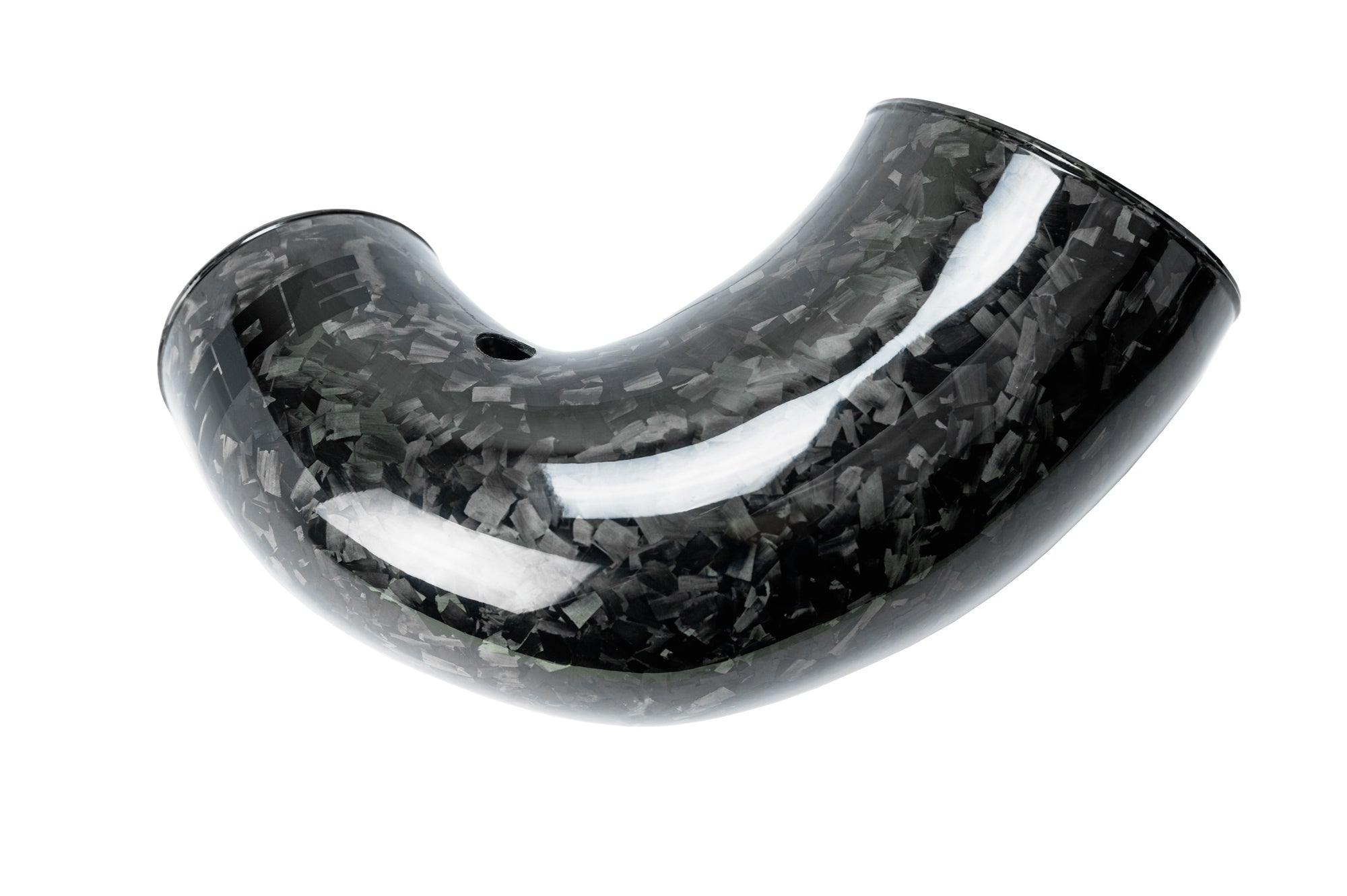 Our main inlet tube is made of genuine Forged carbon fiber manufactured in billet molds and then processed in an autoclave. All excess resin is pulled out under vacuum creating a strong lightweight part. It has a large 4.5" opening on the throttle body side terminating to a large 6" opening for the filter engineered into the best possible shape from point A to B with no weird flat clearance spots. It fills the void and uses all the space provided.