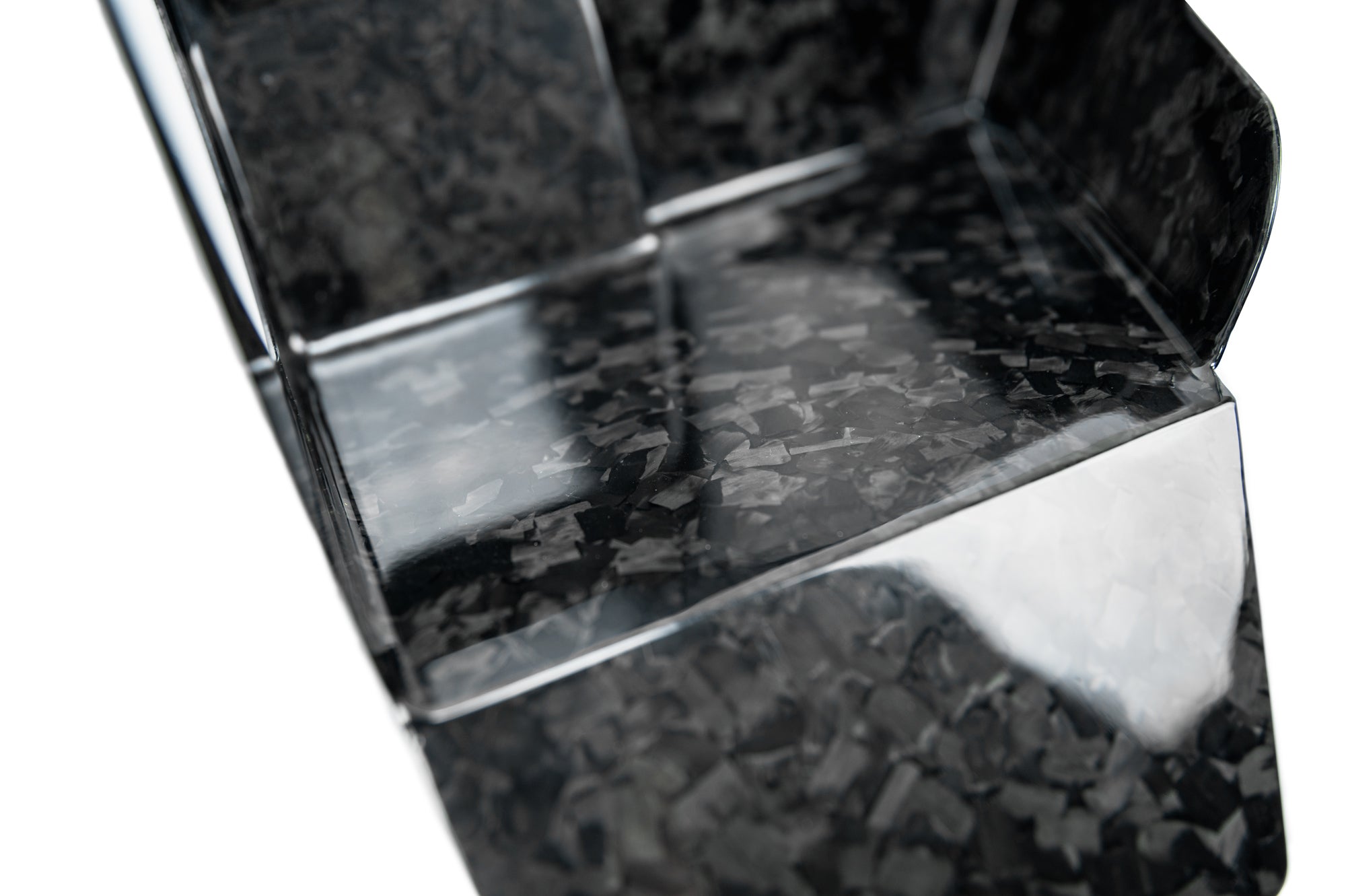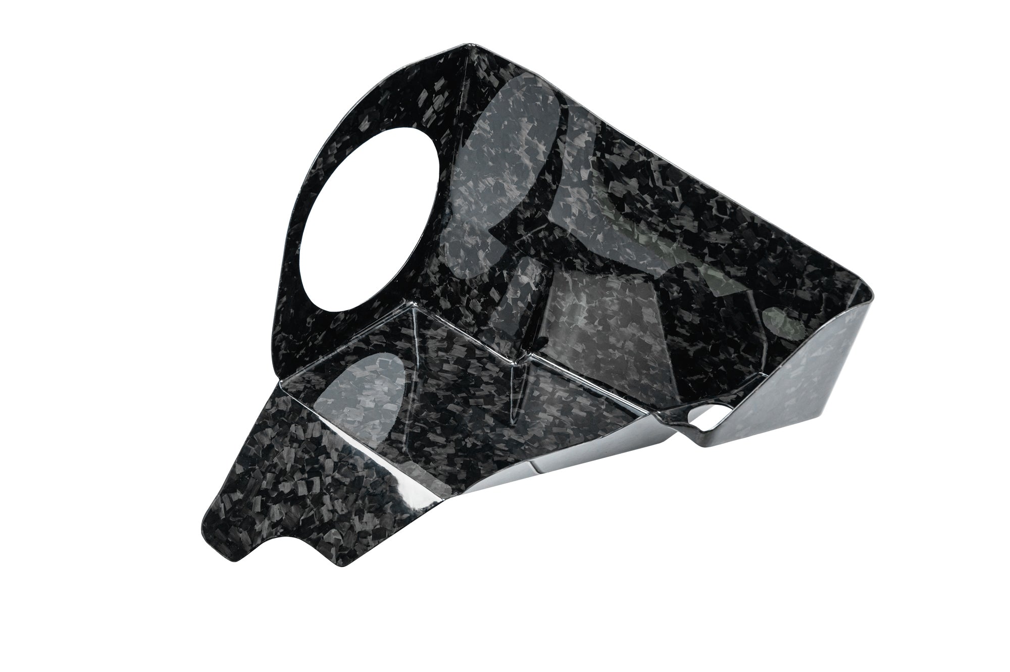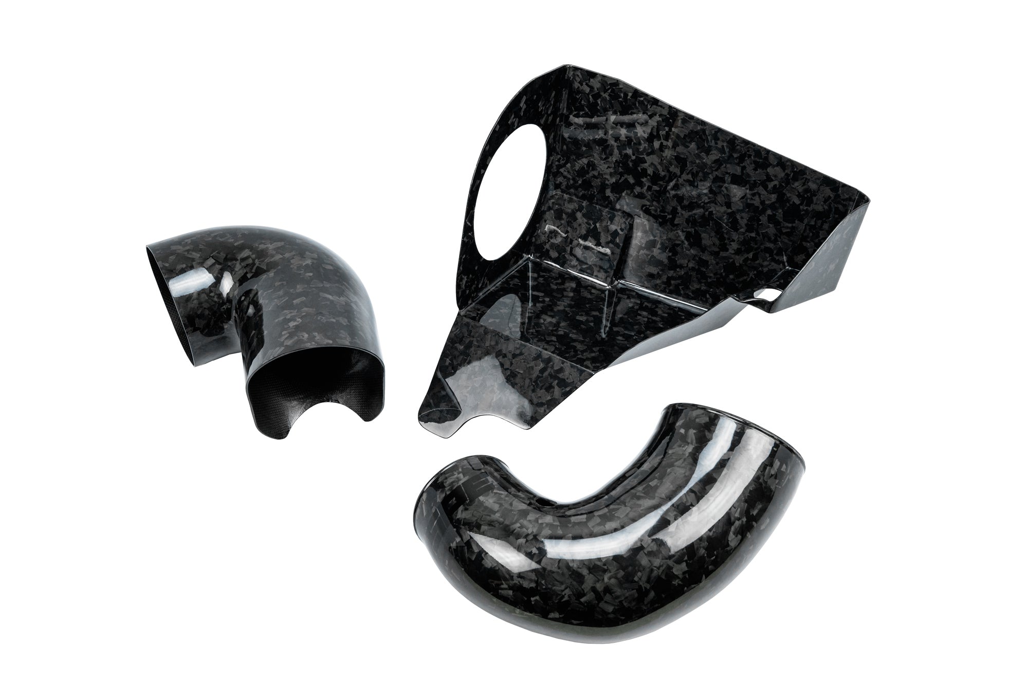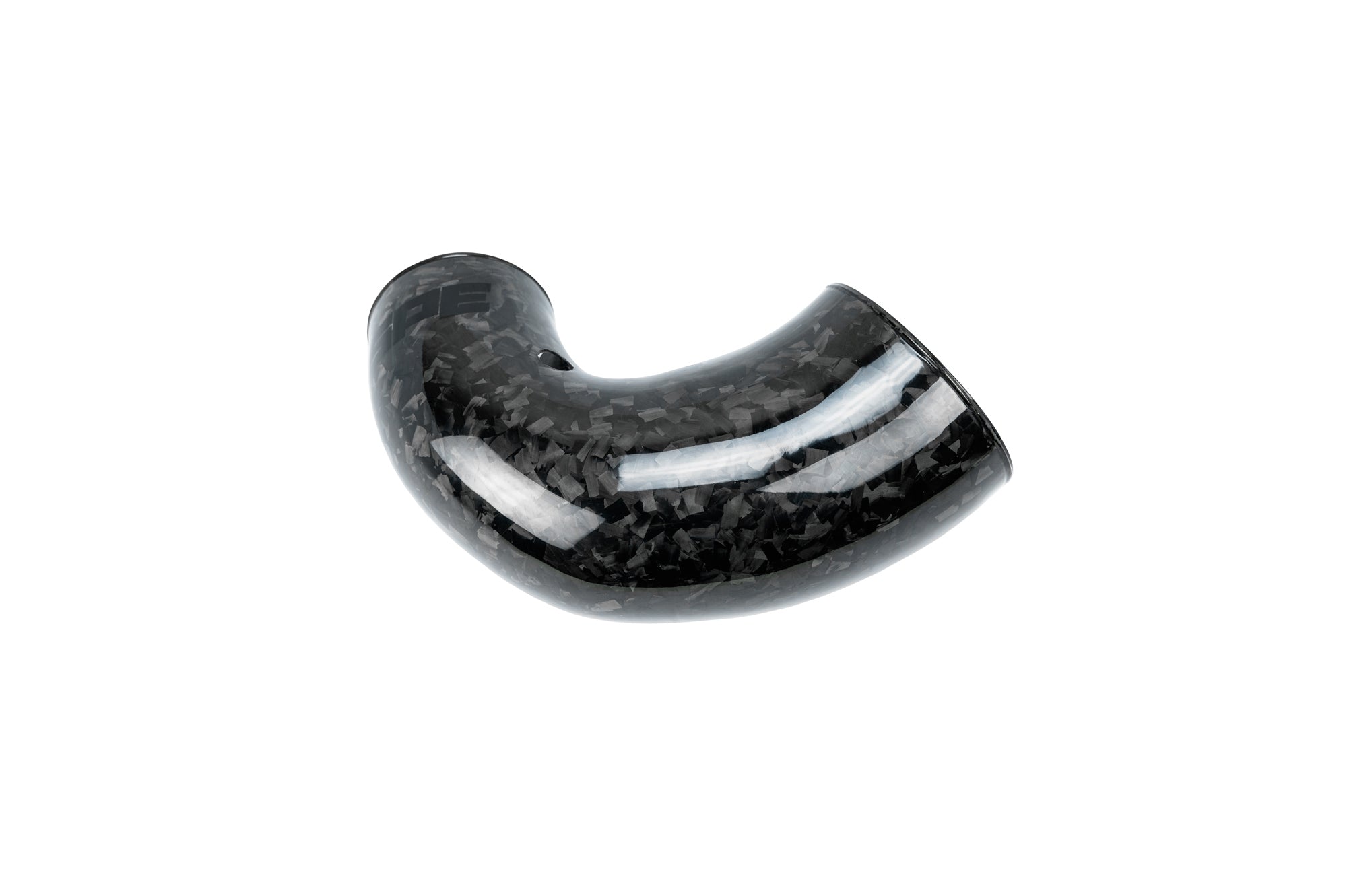Our main inlet tube is made of genuine Forged carbon fiber manufactured in billet molds and then processed in an autoclave. All excess resin is pulled out under vacuum creating a strong lightweight part. It has a large 4.5" opening on the throttle body side terminating to a large 6" opening for the filter engineered into the best possible shape from point A to B with no weird flat clearance spots. It fills the void and uses all the space provided.