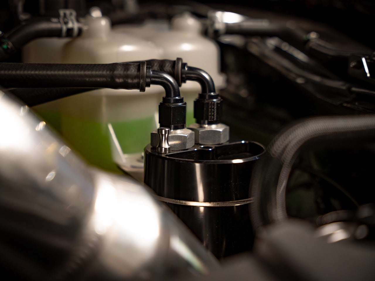 The can is machined from high-quality materials and finished in a black anodizing for a clean OEM look. The bracket is formed stainless steel for strength and corrosion resistance. All hoses, fittings, and hardware are designed to handle engine bay heat, vibration, and long-term use.